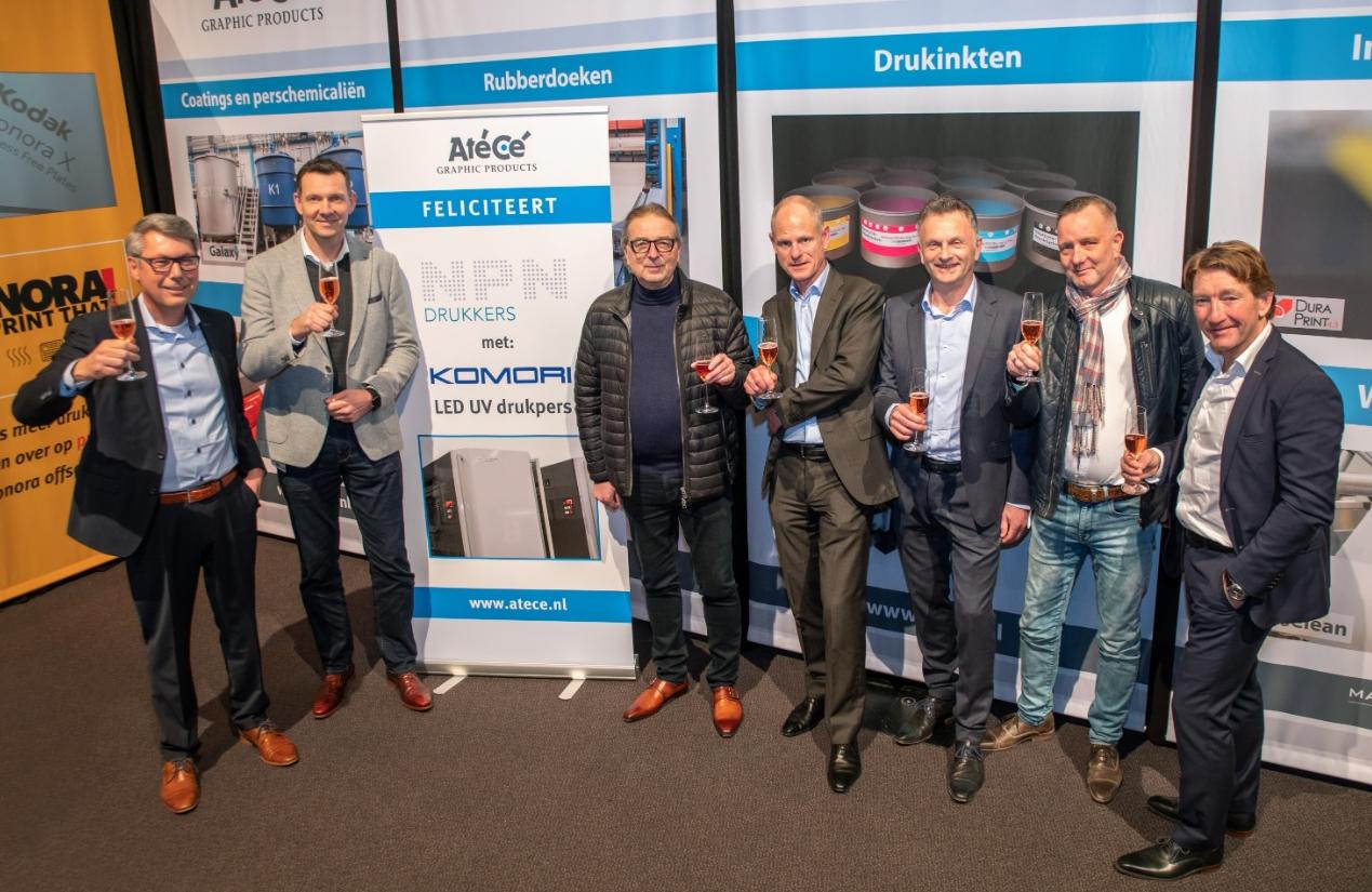 Foto v.l.n.r.: Jeroen Hulshoff (Komori), Perry de Jong en Erik de Lorme (NPN Drukkers), Remco Smit (AtéCé), Gert Muller (Komori), Ron Baartman (NPN Drukkers) en Harry Vlasveld (AtéCé).