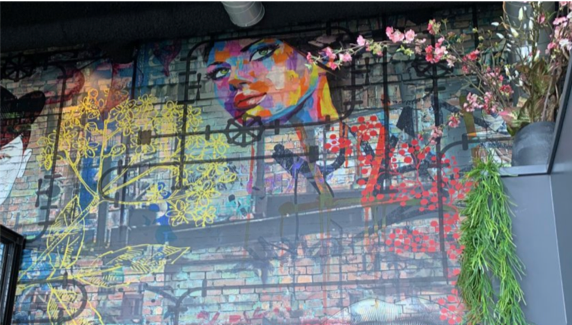 Loes Kok: “We wilden dit chique restaurant een stoere uitstraling en ‘street’vibe geven die past bij de trendy wijk waar oude pakhuizen zijn omgebouwd tot loft-stijl appartementen, boetieks en restaurants. Het interieur van het restaurant was ongelooflijk mooi, maar miste de look en feel die past bij de industriële omgeving. Het formaat van de muren was een kans om een gigantische muurschildering te creëren en digitaal drukwerk maakte het mogelijk om dit kunstwerk op ware grootte te printen. We hebben voor Coala behang met een leer-look en feel gekozen om textuur aan het ontwerp toe te voegen. We zijn erg blij met het resultaat: het restaurant ziet eruit als één geheel, chique en modern tegelijk.”